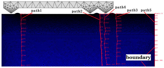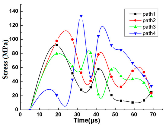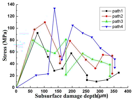 - The depth, propagation direction, amounts, density, and distribution of subsurface cracks are all affected by the stress wave superposition effect. Furthermore, at about 70 µs, the stress values of paths 1, 2, 3 are all about 20 MPa, the stress value of path 4 is 32 MPa, and the stress value of path 5 is 49.5 MPa, which indicate that in addition to path 4, there is also a stress superposition in path 5, this indicates that the stress superposition on the boundary of the component may be one of the main influencing factors leading to the edge collapse.