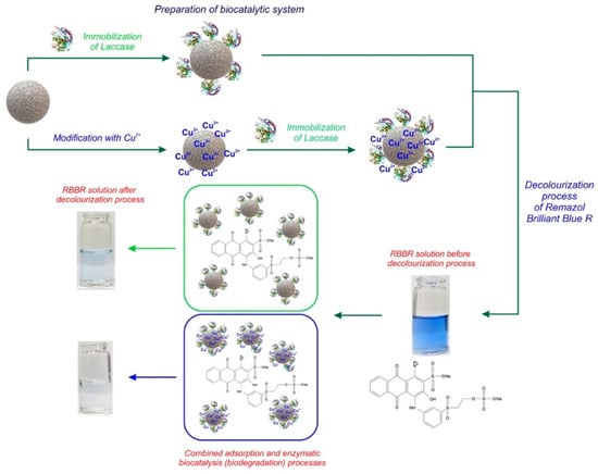 - Antecka, K.; Zdarta, J.; Siwińska-Stefańska, K.; Sztuk, G.; Jankowska, E.; Oleskowicz-Popiel, P.; Jesionowski, T. Synergistic degradation of dye wastewaters using binary or ternary oxide systems with immobilized laccase. Catalysts 2018, 8, 402. [Google Scholar] [CrossRef]