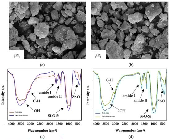 SEM and FTIR spectral analyses were performed in order to confirm both the effective synthesis of ZrO2–SiO2 and ZrO2–SiO2/Cu2+ oxide systems and immobilization of laccase onto the obtained materials (Figure 3). The morphology of materials was evaluated based on SEM images, presented in Figure 3a,b, respectively. The obtained materials are characterized by irregular particles, 5 μm in diameter, which tend to aggregate. It is worth noticing that there were no significant changes in the structure of oxide material before and after doping with Cu2+.