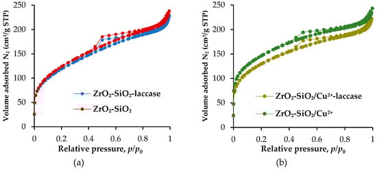 The results of low-temperature N2 adsorption/desorption for materials before and after immobilization process are presented in Figure 4. Each of the illustrated isotherms (for ZrO2–SiO2, ZrO2–SiO2–laccase, ZrO2–SiO2/Cu2+ and ZrO2–SiO2/Cu2+–laccase systems) was classified as type IV with type H4 hysteresis loops. The calculated values of BET surface area, the total pore volume and the mean pore diameter are presented in Table 1. The parameters of the porous structure of the materials before laccase immobilization showed that the analyzed samples possessed higher surface area and total pore volume compared to the ZrO2–SiO2–laccase and ZrO2–SiO2/Cu2+–laccase systems. These results confirm the effective enzyme immobilization onto the surface and inside the pores of the synthesized oxide materials.