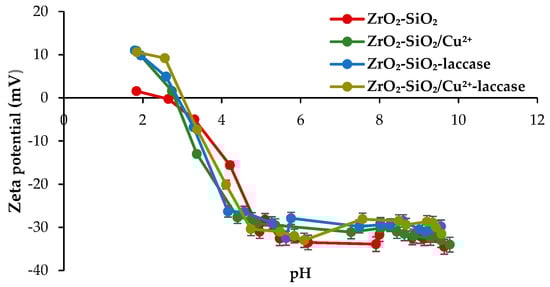 The zeta potential is an important feature for the evaluation of the surface properties of the oxide materials []. The obtained results (zeta potential vs. pH) for both pure and Cu2+-doped materials before and after the immobilization process are presented in Figure 5. It can be observed that the zeta potential values of all samples are negative in the analyzed pH range. In addition, it can be concluded that the zeta potential strongly depends on the pH value. Beyond the isoelectric point (IEP), which is almost the same for each of the samples and equal to 3, the zeta potential values become positive. Moreover, it should be underlined that the zeta potential after functionalization and enzyme immobilization is almost unaltered, due to the relatively low amount of Cu2+ ions or laccase which were deposited onto the surface of oxide system. Nevertheless, values of IEP close to 3 were mainly caused by the presence of silica in the oxide material, the IEP of which is located between 2 and 3 [,]. However, the slight shift of isoelectric point values towards higher pH for samples after laccase immobilization indicated that the attached enzyme also affected the electrokinetic properties of the analyzed samples as laccase possesses two IEP, the first one at approx. pH 3 and the second in a pH range of 4.6–6.8, as previously reported by Jolivalt et al. []. Moreover, each of tested systems possessed higher stability in neutral and alkaline environment (pH above 6).