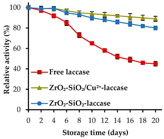 Storage stability is one of the crucial parameters which indicate the possibility to use the immobilized enzymes at an industrial scale. The investigation of the storage stability of the free and immobilized laccases was carried out over 20 days (Figure 6). After 20 days of storage, laccase deposited onto ZrO2–SiO2 and ZrO2–SiO2/Cu2+ exhibited definitely higher catalytic activity (over 80%), as compared to the native enzyme (43%). However, a slight difference between the relative activity of laccase immobilized onto initial and Cu2+-doped oxide system can be observed. The enzyme deposited onto material doped with copper ions retained approx. 90% activity, as laccase immobilized onto ZrO2–SiO2 possessed only 82% of its initial activity after 20 days of storage. The higher activity of the enzyme immobilized onto both oxide systems might be explained by the stabilization of the biocatalyst structure upon immobilization and protective effect of the support material, which was also shown in previously published studies []. Nevertheless, the higher relative activity of the laccase immobilized onto Cu2+-doped oxide material is directly associated with the additional reinforcement of the enzyme structure by the metal ions []. The presented results correspond well with the data published by Fu et al., regarding the degradation of bisphenol A using laccase–copper phosphate hybrid nanoflowers. After 60 days of storage, the immobilized biocatalysts retained 90% of its initial activity []. In another study, presented by Batule et al., the laccase nanoflowers synthesized with copper phosphate significantly enhanced enzyme stability, which exceeded 95% after 1 month of storage. Moreover, after that time free laccase demonstrated only approx. 20% of its initial activity []. These results confirm the stabilizing effect of copper ions towards laccase structure and its activity.