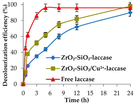 The first step of investigations concerning the dye decolorization process involved testing of the sorption capacities of ZrO2–SiO2 and ZrO2–SiO2/Cu2+ oxide systems toward RBBR. For this purpose, supports with thermally inactivated enzyme were placed into solution of the dye at concentration of 50 mg/L. The results showed that sorption efficiencies were equal to 6.38% and 0.52% for the ZrO2–SiO2–laccase and ZrO2–SiO2/Cu2+–laccase, respectively. Since the error values of the measurements were estimated at 3%, it can be concluded that sorption of the dye onto the obtained materials was negligible. These results can be compared with our previous study [], in which the sorption efficiencies of the RBBR dye from solution at concentration of 10 mg/L for oxide materials such as TiO2–ZrO2 and TiO2–ZrO2–SiO2 were equal to 46% and 28%, respectively.