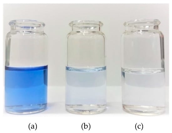 The solutions of the RBBR dye: (a) at initial concentration of 50 mg/L, (b) after decolorization using ZrO2–SiO2–laccase and (c) after decolorization using ZrO2–SiO2/Cu2+–laccase. Each of experiment was conducted at 30 °C and pH 4 within 24 h.