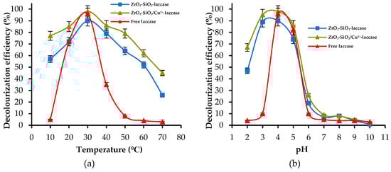 In the analyzed temperature range, the decolorization process occurred with higher efficiencies when the dye was degraded in a system containing copper ions. It is worth mentioning that the most significant difference between the removal rates of the dye obtained using both types of materials was equal to approx. 25% at 10 °C. Nevertheless, the highest values of dye removal were obtained at 30 °C, irrespectively of the biocatalytic system used. It should also be added that even at 60 °C both systems after immobilization allowed for the removal of more than 50% of the dye. However, increase of the temperature to 70 °C caused a decrease of the decolorization efficiency, which reached 26% for ZrO2–SiO2–laccase and 45% for ZrO2–SiO2/Cu2+–laccase, respectively. This fact may be related to the thermal inactivation of the enzyme. The obtained results were compared with the data presented by Tapia-Orozco et al., which were focused on laccase immobilized onto TiO2 particles. The obtained biocatalytic system was tested at 80 °C and showed a lack of enzymatic activity []. Conclusion can be drawn based on the analysis of the results which show effect of pH on the decolorization efficiency (Figure 9b). Over the tested pH range, the removal rates were higher when the ZrO2–SiO2/Cu2+–laccase system was used. Moreover, the highest decolorization efficiency was achieved at pH 4 for both systems. Significant decrease of the decolorization efficiency was noticed when the process was realized at the pH range of 6–10. This may result from the reduction of catalytic activity of laccase in the near-neutral and basic environment due to conformational rearrangements in the structure of biomolecule, caused by changes in the nature of aminoacid groups [].