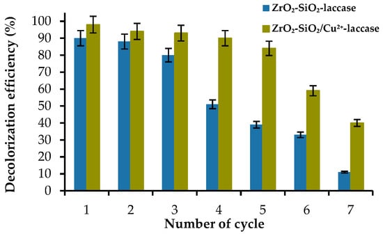 Reusability as well as storage stability are important parameters which need to be considered when immobilized enzymes are used at an industrial scale. The possibility to use the biocatalytic systems multiple times possesses many advantages, the most important among which is the reduction of process costs []. In the presented study, the decolorization efficiency of the RBBR dye by ZrO2–SiO2–laccase and ZrO2–SiO2/Cu2+–laccase systems was tested over seven successive decolorization cycles (Figure 10).