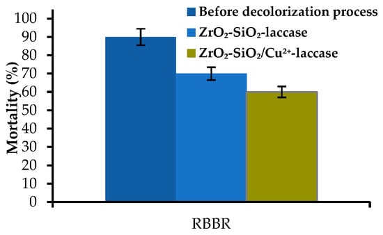 In order to determine the lethal concentration of the RBBR dye, solutions of the dye at different concentrations, ranging from 0.5 to 50 mg/L, were tested. It was evaluated that the LC50 of the RBBR dye before enzymatic treatment towards Artemia salina larvae as a model microorganism is equal to 16 mg/L. Moreover, the mortality of the tested microorganisms was lower after the decolorization process (pH 4, 30 °C and 24 h) by 20 and 30% for ZrO2–SiO2–laccase and ZrO2–SiO2/Cu2+–laccase, respectively, as compared to dye solution before enzymatic treatment (Figure 11).