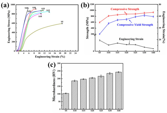 - With the increase in ball milling duration, the compressive strength, yield strength and Vickers microhardness of the sintered samples increased gradually but the engineering strain decreased. The compressive strength, yield strength, Vickers microhardness and engineering strain after ball milling for 30 h were ~908 MPa, ~853 MPa, ~235 HV and ~8.1%, respectively.