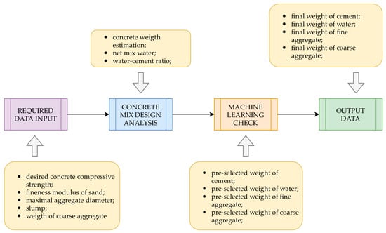 Block diagram of the practical application of machine learning in the concrete mix design.