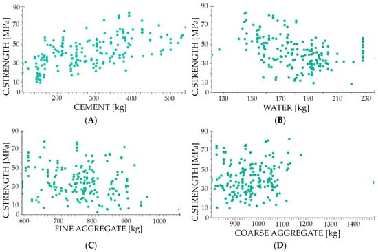 The scatter plots target versus input variables. The vertical axis is the full compressive strength of concrete expressed in megapascals. The horizontal axis is the amount of material in kilograms for cement and aggregate as well as in litres for water. (A) Cement; (B) water; (C) Fine aggregate (sand 0–2 mm); and (D) coarse aggregate (aggregate above 2 mm). The legend is in the left bottom corner.