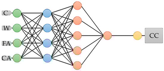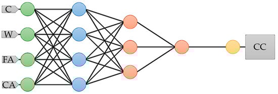 Finally used the architecture of ANN. The figure shows network architecture that includes following parts, principal components (blue), perceptron neurons (red), and, because we use feature scaling, there are scaling and unscaling layer. The scaling and unscaling neurons are green and yellow, respectively. Abbreviations: [C]—cement; [W]—water; [FA]—fine aggregate; [CA]—coarse aggregate; [CC]—full compressive strength of concrete.