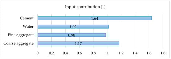 We have assessed the impact of individual variables on the final result, which is presented in Figure 4. We eliminated training input selectively and inspected the output results. An input contribution value 1.0 or lower than one denotes that the variable has less contribution to the results. Successively, a value higher than 1.0 means a more significant contribution. Our analysis indicates that the biggest contribution to the results have cement, which is in line with our assumptions that the water-cement ratio has the most significant impact on concrete strength. Literature findings also confirm that the cement content and type have a high influence on the compressive strength []. There are also other issues, including curing conditions and added admixture impact, that influence the compressive strength and concrete durability, especially an environments with a high risk of carbonation []. The detailed nature and the shape of the aggregate influence the workability and durability of concrete. The shape and texture of the aggregate affect the properties of fresh concrete more than hardened concrete []. Additionally, the grading or size distribution of aggregate is an important characteristic because it determines the paste requirement for workable concrete []. However, in our procedure, we did not make an exact distinction between the nature and shape of the aggregate. We only diversified the coarse and fine aggregates and sacrificed it for the sake of having larger data sample pools in these two categories. We also have not analysed the impact of environmental aggression and admixtures.