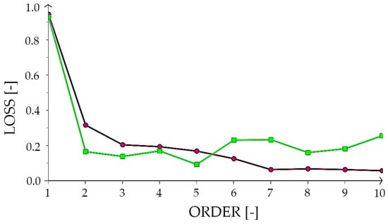 We performed input selection by the growing inputs algorithm [,,,]. We found the optimal number of neurons by the order selection algorithm [,]. We carried out the output selection by the incremental order algorithm [,,]. The loss history for the subsets used is presented in Figure 5.