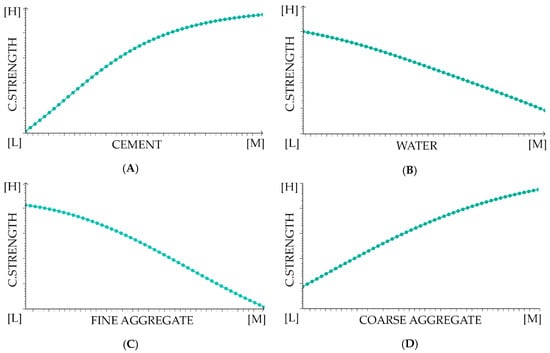 Output charts. The diagrams show variations in output variables for a single input variable, while the others are fixed. The vertical axis is the full compressive strength of concrete. The horizontal axis is the amount of material. (A) Cement; (B) water; (C) fine aggregate (sand 0–2 mm); (D) coarse aggregate (aggregate above 2 mm); [H], [M]—Higher/More; [L]—Lower/Less.