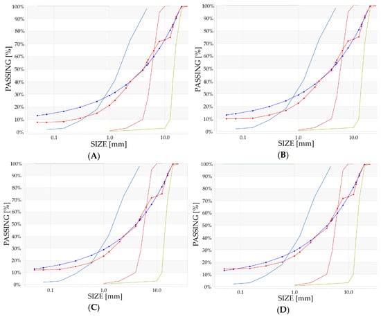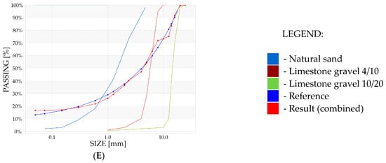 We compared the presented Formula (19) with a standard concrete mix design approach, based on the Bolomey design method. The comparison was prepared for 1 m3 of concrete designed for the concrete slab, with direct pouring, plastic slump, no special desired finishing, no special ambient conditions when casting, and negligible environmental aggression. To design a concrete mix, we used the following materials: Portland cement; network water; natural sand; limestone gravel 4/10 mm; and limestone gravel 10/20 mm. The tested recipes are presented in Table 3. The gradings and fitting curves for the designed recipes are shown in Figure 8. The comparison is presented in Figure 9.