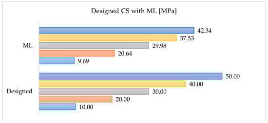 Comparison between designed Compressive Strength (CS) and calculated from Machine Learning (ML) formula.