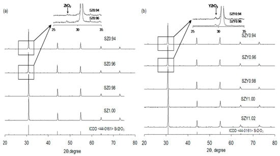 Powder XRD patterns of (a) SZx and (b) SZYx. The insets show fragments of diffractograms in the 2θ angles from 25° to 35° for x = 0.94 and 0.96.
