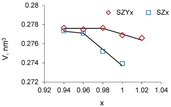 The unit cell volume as a function of Sr content for undoped and Y-doped strontium zirconate is presented in Figure 2. As can be seen, the volume of SZYx unit cell is bigger than that of SZx that can be explained by the lattice expansion under thr introduction of Y3+ in Zr4+ sites (the ionic radii of Zr4+ and Y3+ ions with the coordination number six are 0.72 and 0.9 Å, respectively). Besides, the unit cell volume of SZx and SZYx increases with decreasing Sr content up to x = 0.96 and 0.98, respectively, and then stays nearly constant. This observation indicates that a solid solution of strontium vacancies in strontium zirconate crystal structure forms at low Sr deficiency (x > 0.96 and 0.98 for SZx and SZYx, respectively), whereas precipitates of a second phase start to form at lower x values.