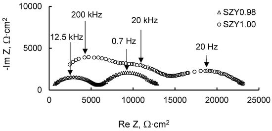 The electrical conductivity of SZx and SZYx was determined by deconvolution of the impedance spectra. For illustration, the spectra for SZY0.98 and SZY1.00 at 550 °C are given in Figure 4. The Nyquist plots for SZY1.00 exhibit three semicircles: the first semicircle is due to the contribution of bulk properties of the material at high frequency, the second is due to the grain boundaries at a medium frequency, and the third is due to electrode polarization. Nyquist plots were modeled by the equivalent circuit (RbQb)(RgbQgb)(RelQel) composed of three parallel RQ elements (R is a resistor, Q is a constant phase element) connected in series. The resistors Rb, Rgb and Rel represent bulk, grain boundary and electrode polarization resistances, respectively.