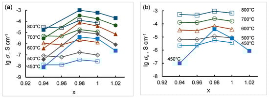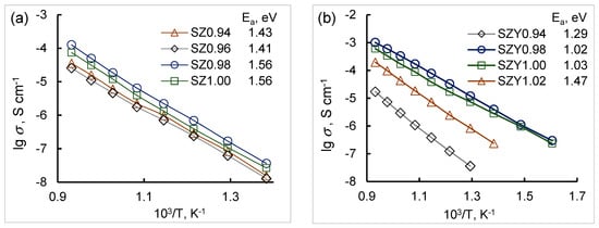 The defect model expressed by Equations (1)–(3) shows that both acceptor doping in B sites and A-site cation deficiency should result in the increasing oxygen vacancy concentration that gives rise to the ionic conductivity. The model describes well the experimental data on the conductivity of SZx and SZYx at x > 0.98: Firstly, as can be seen in Figure 6 and Figure 7 yttrium doping results in increased conductivity of SZYx comparing to SZx due to higher concentration of oxygen vacancies. Secondly, Sr deficiency of up to x ~ 0.98 creates additional oxygen vacancies as it follows from XRD data (Figure 2), so that SZ0.98 and SZY0.98 have the highest conductivity. Overstoichiometric nominal strontium content (x = 1.02) leads to decrease in conductivity which might result from the decreasing concentration of oxygen vacancies.