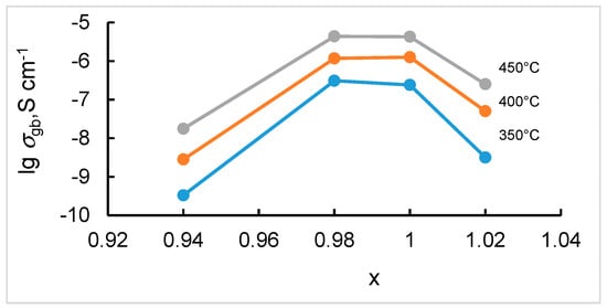 The conductivity of grain boundaries of SZYx also depends on Sr stoichiometry exhibiting the highest values at x = 0.98 and 1.00 as can be seen in Figure 8. The grain boundary conductivity behavior does not correlate with the grain size change in SZYx which indicates that other factors have a greater impact on it. Increasing of the conductivity with decreasing Sr content at high x (x > 0.98) can be caused by formation of additional oxygen vacancies for charge compensation of A site vacancies. Decreasing of the conductivity at lower x can be caused by the blocking effect of the low conductive phase precipitated at the grain boundaries, besides, the dopant partitioning over A and B sites can also occur at the grain boundaries.
