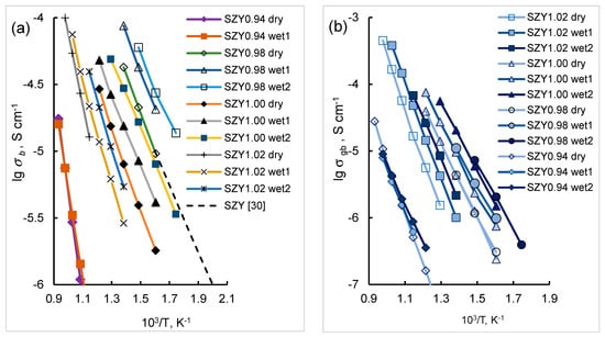 Arrhenius plots of bulk (a) and grain boundary (b) conductivity of SZYx in dry (pH2O = 40 Pa) and wet air (wet1—pH2O = 610 Pa, wet2—pH2O = 4250 Pa). The lines between points are only a guide to the eye. Conductivity of a single-crystalline SrZr0.95Y0.05O3−δ measured in dry air [30] is given for comparison.