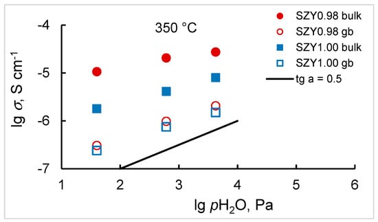 Dependences of the bulk and grain boundary conductivity of the most conductive samples, SZY0.98 and SZY1.00, on water vapor partial pressure in logarithmic scale at 350 °C are shown in Figure 10. As can be seen, the slope of the dependences is close to ½ being in agreement with the suggested model of proton defect formation (Equation (9)).