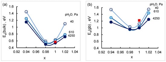 The activation energies of the bulk and grain boundary conductivity are found to depend on Sr content having the lowest value at x = 0.98 and decrease with a rise in water vapor partial pressure as shown in Figure 11. The values of activation energy obtained in the present research are consistent with the reported data for SrZr0.95Y0.05O3−δ in wet nitrogen [25] which are also given in Figure 11. The higher values of the activation energy of the grain boundary conductivity comparing to the bulk indicate the existence of an additional energy barrier which can be related with the formation of space charge layers at the grain boundaries [31].