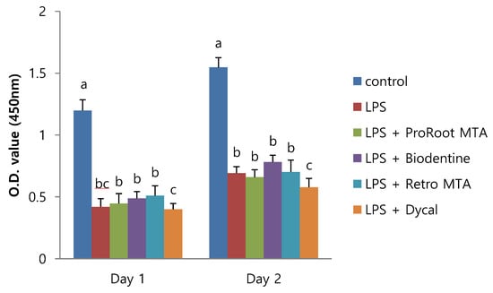 hDPSCs were seeded in a 96-well plate (SPL) at a density of 2 × 104 cells per well. After LPS stimulation, the medium was changed to a material extract conditioned medium. Cell viability was examined at 24 h and 48 h using Cell Counting Kit-8 (Dojindo Molecular Technologies, Rockville, MD, USA) according to the manufacturer’s instructions. The absorbance was measured at 450 nm using a spectrophotometer (VersaMaxMultiplate Reader, Thermo Fisher Scientific, Waltham, MA, USA).