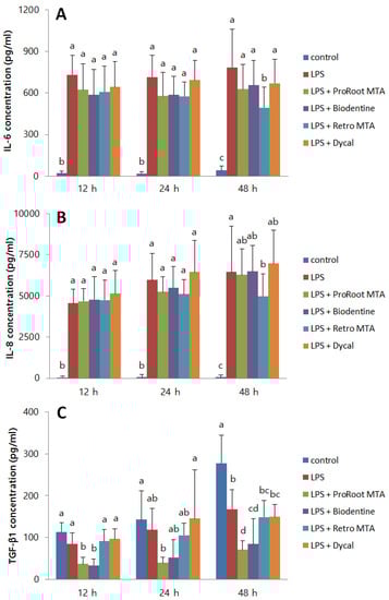 The effects of CSCs on the inflammatory response of LDPSCs. (A) IL-6, (B) IL-8, and (C) TGF-β1 expressions were measured using the enzyme-linked immunosorbent assay. (A) IL-6: a > b, c; b > c (p < 0.05), (B) IL-8: a > b, c; b > c (p < 0.05), (C) TGF-β1: a > b, c, d; b > c, d; c > d (p < 0.05), different alphabet letters represent statistically significant differences between the materials within the same time group. Control, hDPSCs cultured with normal medium; LPS, LDPSCs cultured with normal medium; LPS + ProRoot MTA, LDPSCs cultured with ProRoot MTA extract medium; LPS + Biodentine, LDPSCs cultured with Biodentine extract medium; LPS + Retro MTA, LDPSCs cultured with Retro MTA extract medium; LPS + Dycal, LDPSCs cultured with Dycal extract medium.