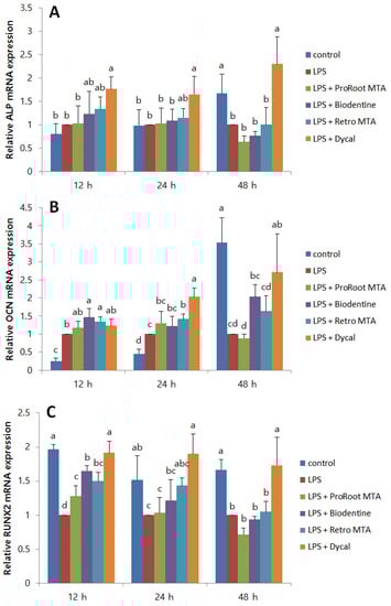 The effects of CSCs on the ALP, OCN, and RUNX2 expressions of LDPSCs. Relative (A) ALP (B) OCN, and (C) RUNX2 expressions were measured using quantitative real-time polymerase chain reaction (qPCR) and normalized using β-actin. (A) ALP: a > b (p < 0.05), (B) OCN: a > b, c, d; b > c, d; c > d (p < 0.05), (C) RUNX2: a > b, c, d; b > c, d; c > d (p < 0.05), different alphabet letters represent statistically significant differences between the materials within the same time group. Control, hDPSCs cultured with normal medium; LPS, LDPSCs cultured with normal medium; LPS + ProRoot MTA, LDPSCs cultured with ProRoot MTA extract medium; LPS + Biodentine, LDPSCs cultured with Biodentine extract medium; LPS + Retro MTA, LDPSCs cultured with Retro MTA extract medium; LPS + Dycal, LDPSCs cultured with Dycal extract medium.