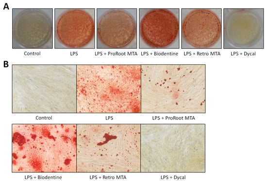 The effects of CSCs on the odontogenic differentiation of LDPSCs. ARS staining was performed after 14 days. (A) Photographs of the experimental wells; (B) microscope images of 40× magnification are shown. Control, hDPSCs cultured with normal medium; LPS, LDPSCs cultured with normal medium; LPS + ProRoot MTA, LDPSCs cultured with ProRoot MTA extract medium; LPS + Biodentine, LDPSCs cultured with Biodentine extract medium; LPS + Retro MTA, LDPSCs cultured with Retro MTA extract medium; LPS + Dycal, LDPSCs cultured with Dycal extract medium.