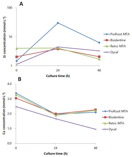 We evaluated the Si ion concentrations of the material extract media, and ProRoot MTA showed significantly higher levels of Si ion concentrations at all time points compared to the other materials. Biodentine, Retro MTA, and Dycal also showed differing levels and patterns of Si ion release. The difference in material composition may account for the varying ion concentrations of materials. Whereas ProRoot MTA is known to contain 21.1 wt % of SiO2 [32], Retro MTA contains 5–15 wt % SiO2. Moreover, Biodentine mainly consists of tricalcium silicate and dicalcium silicate. Such differences in ion concentration may have affected the production of IL-6, IL-8, and TGF-β1 among the CSCs.