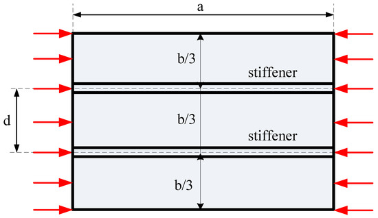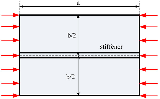 We considered a rectangular plate with two parallel stiffeners, as shown in Figure 12, with b = 0.2 m, a/b = 2.5. The geometrical parameters of the stiffener were hs = 2h, bs = b/100. The buckling coefficient of the plate can be determined by the following formula: