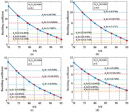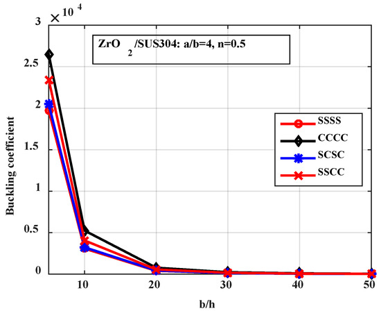 In this study, the thickness of the plate (the plate model is given in Figure 12) had values from b/50 to b/5, and the numerical results are shown in Figure 15. We can again see the same phenomenon as in the case of the plate with a central stiffener. When the volume fraction index n increased, the buckling coefficient of Si3N4/SUS304 plate increased, and the buckling coefficient of ZrO2/SUS304 plate decreased. The reason for this is that the plate became softer.