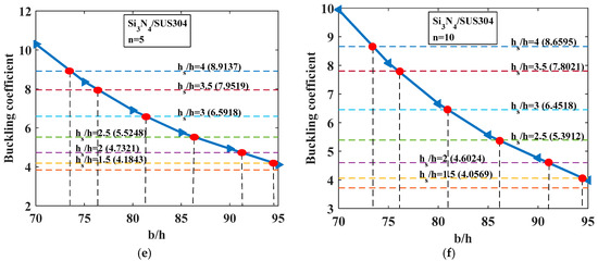 Buckling coefficient of FGM (Si3N4/SUS304) plate. Solid blue line: buckling coefficient of plate without stiffeners (b/h = 70–95); horizonal dash-dot line: buckling coefficient of plate with a central stiffener (b/h = 100) with various hs/h ratios. (a) n = 0.1; (b) n = 0.5; (c) n = 1; (d) n = 2; (e) n = 5; (f) n = 10.