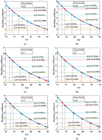 Buckling coefficient of FGM (ZrO2/SUS304) plate. Solid blue line: buckling coefficient of plate without stiffeners (b/h = 70–95); horizontal dash-dot line: buckling coefficient of plate that has central stiffener (b/h = 100) with various hs/h ratios. (a) n = 0.1; (b) n = 0.5; (c) n = 1; (d) n = 2; (e) n = 5; (f) n = 10.