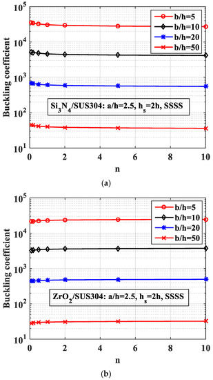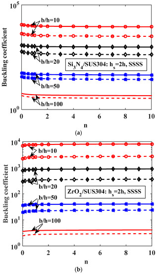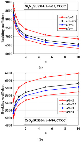 Second, similar to the previous sections, when the volume index fraction n increased, the buckling coefficient of the Si3N4/SUS304 plate decreased, and the buckling coefficient of the ZrO2/SUS304 plate increased.