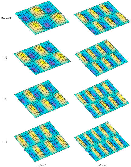 Figure 18 presents the first four buckling mode shapes of the FGM plate for two cases, i.e., a/b = 2 and a/b = 5; the plate is fully simply supported (SSSS). We can see that both the boundary condition and the a/b ratio strongly affected not only the buckling loads but also the buckling mode shapes of the structure.