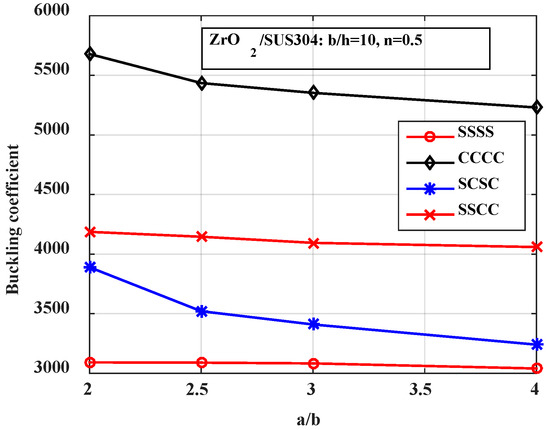 We next explored the effects of the length-to-width ratio (a/b). The geometrical parameters were b = 0.2 m, h = b/10. We changed the length a and the volume fraction index n, and the results are plotted in Figure 17. As can be seen from the figure, the length-to-width ratio (a/b) had a robust influence on the buckling coefficient of the structure. This point can be explained by the fact that when the a/b ratio decreased, the length a correspondingly increased. This led to the plate becoming “softer”, and the buckling coefficient was therefore reduced.