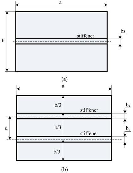 The effects of the width of the stiffener and the distance between two stiffeners were studied. We compared the buckling loads between the plate with two stiffeners (bs = b/100, bs = b/200, Figure 13b) and the one with one central stiffener (bs = b/100, Figure 13a).