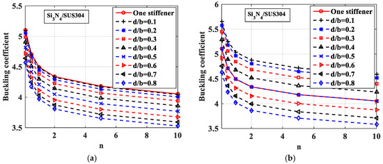 Note that in Figure 6, the solid lines and dash-dot lines represent buckling coefficients of stiffened and unstiffened plates, respectively. The solid lines are always higher than the dash-dot lines, meaning that the buckling load of the stiffened plate was larger than that of the unstiffened plate. This proves that the stiffness of the plate will increase by the addition of the stiffener. We can see that when the thickness of the plate increased with a central stiffener, the plate became stiffer, leading to an enhancing of the buckling load of the plate. When the volume fraction index n was increased, the buckling load of the ZrO2/SUS304 plate got larger; in contrast, the buckling load of the Si3N4/SUS304 plate got smaller.