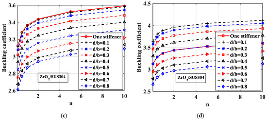 By varying the volume index fraction n and the distance between the two stiffeners d, we obtained the numerical results of the buckling coefficients of the plate, as plotted in Figure 14.