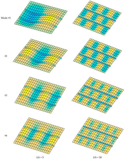 Figure 16 presents the first four buckling mode shape of the plate with b/h = 5 and b/h = 50. We can see that the thickness of the structure strongly affected the buckling loads as well as buckling mode shapes.