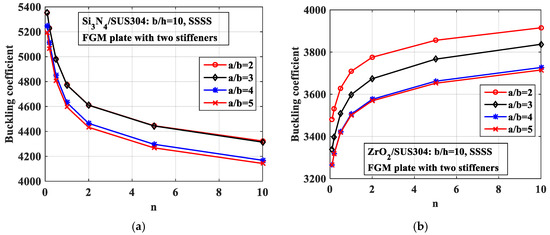 Next, the authors evaluated the influence of the gradient index n on the buckling response of the plate. We considered two cases of plates made of Si3N4/SUS304 or ZrO2/SUS304 with geometrical parameters hs = 2h, bs = b/100 and b/h ratio value of 10, 20, 50, and 100; the plate was fully simply supported (SSSS). By changing the volume fraction index n from 0.1 to 10, we had a variation of buckling coefficients of FGM plates with one central stiffener and without stiffeners, as shown in Figure 6.