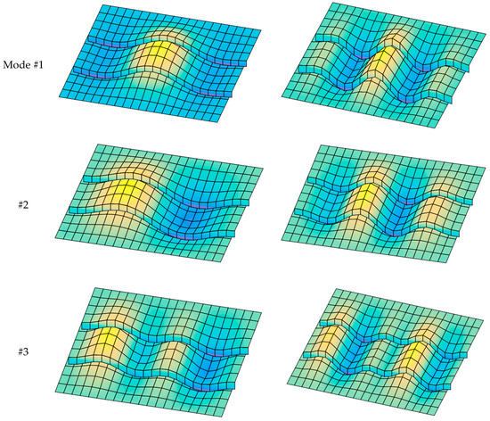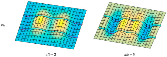 Figure 9 presents the first four buckling mode shapes of the stiffened plate with a/b = 2 and a/b = 4. The results demonstrate that the length and width of the plate strongly affected the buckling mode shape of the structure.