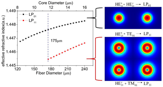 We first checked the standard SMF G.652. The refractive indices of the fiber core n1 and cladding n2 are set as 1.450 and 1.445; the initial fiber diameter 2r2 is 125 μm, and the core diameter 2r1 is 8.3 μm. The working wavelength is 1550 nm. The results are shown in Figure 1. When the fiber diameter increases from 125 μm to 240 μm, the core diameter ramps up from 8.3 μm to 15.9 μm gradually. The fiber starts to support the LP01 and LP11 modes, when its outer diameter is larger than 175 μm. The co-existence of the two modes is kept, when the fiber diameter is between 175 and 240 μm. The LP modes are superpositions of vector modes namely HE and TE/TM modes, for example, the LP11 mode, is four-fold degeneracy of the HE21, TE01 and TM01 modes, as clearly depicted in the results of the numerical simulations, as seen in Figure 1.