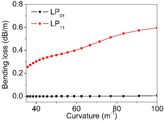 where the Im(neff) is the imaginary part of the effective refractive index, of a supported mode. The confinement losses of the LP01 and LP11 modes, under the bending curvatures ranging from 35 m−1 to 100 m−1, were calculated (Figure 3). It can be seen that the confinement loss of the LP01 mode (black dots) remained small (~10−4 dB/m), while the loss of the LP11 mode (red dots) increased significantly from 0.25 to 0.6 dB/m, when the curvature ramped up from 35 m−1 to 100 m−1. The LP11 mode is deemed as a leaky mode when fiber is bent. Due to this feature, by carefully identifying the reflection peak of the LP11 mode, the TM-FBG can be possibly used for curvature sensing. In addition, by measuring the shift of the reflection wavelength of the LP11 mode, temperature or strain sensing can also be realized simultaneously, using the same TM-FBG.