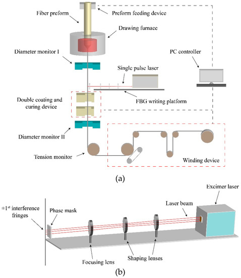 FBG arrays can be written in real time during fiber drawing. Figure 4b shows the FBG writing stage. An excimer laser operating at 193 nm wavelength acts as the UV irradiation source, of which the laser spot size is 6 mm × 12 mm. The pulse width is ~10 ns, and the maximum repetition rate is 500 Hz. The maximum available pulse energy is ~10 mJ. A phase mask is placed ~0.1 mm next to the bare fiber, with a mask size of 10 mm × 10 mm. The laser beam goes through three cylindrical lenses and is then focused onto the phase mask with beam line of 0.7 mm × 10 mm. Through the phase mask, ±1st interference fringes are generated and expose to the bare fiber to inscribe FBG. The period of grating Λ is determined by: