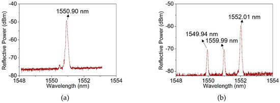 Based on this system, a two-mode FBG array was successfully written on a step-index fiber with a photosensitive core. The optical fiber preform for FBG inscription was the glass preform, with a low amount of germanium, less than 0.6%, doped in the fiber core and the numerical aperture (NA) of 0.14. The fiber possessed the same structure as the standard single-mode optical fiber G.652. The pitch of the phase mask was 1071.93 nm and the laser pulse energy was 8 mJ. The preform used for fiber drawing was a standard one for SMF with a fiber core diameter 8.3 um, and we used the same preform for the fabrication of the two-mode (TM) fiber. Based on our theoretical calculations, it was found for a fiber to support two modes, the core diameter needs to be expanded to 13.3 um, so as the fiber outer diameter to be ~200 um. By controlling the preform feeding and fiber drawing rates, the diameter of fiber was increased from 125 μm to 200 μm, for the reason to draw a TM fiber. To avoid the occurrence of excessive shaking and breaking in grating fabrication process, the drawing speed was controlled at 10–15 m/min and the average drawing tension at 10–30 N. Experimental reflection spectra of the FBG with the fiber diameter of 125 μm and 200 μm are shown respectively in Figure 5a,b, which are in good agreement with the theoretical plots in Figure 2c,d.